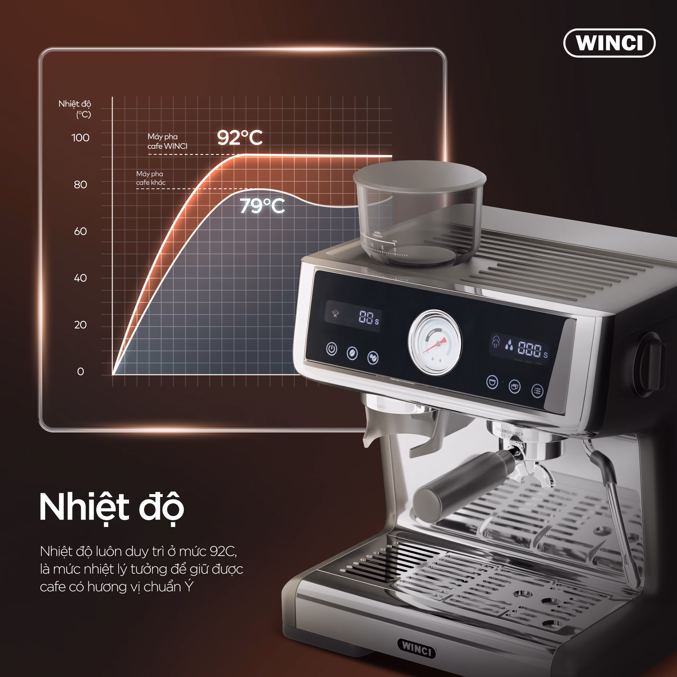 Winci EM58 được trang bị chip PID và cảm biến NTC, đảm bảo nhiệt độ pha chế ổn định ở mức 92°C – nhiệt độ lý tưởng để chiết xuất cà phê espresso đậm đà với lớp crema vàng óng, mịn màng. Áp suất bơm từ 1-20 bar giúp chiết xuất trọn vẹn hương vị và tinh dầu cà phê, mang đến ly espresso chuẩn vị Ý ngay tại nhà.