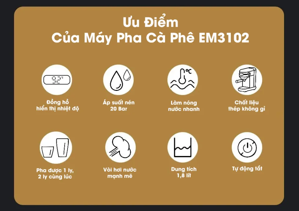 Máy pha cà phê WINCi EM3102 là một trong những sản phẩm máy pha cà phê bán tự động được nhiều người yêu thích và lựa chọn sử dụng hiện nay. Với thiết kế hiện đại, tích hợp nhiều tính năng thông minh, WINCi EM3102 đáp ứng tốt nhu cầu pha chế cà phê espresso, cappuccino, latte art tại gia đình, văn phòng hay các quán cà phê nhỏ, giúp bạn thưởng thức những tách cà phê thơm ngon, đậm đà không khác gì các máy pha cà phê espresso chuyên nghiệp.
