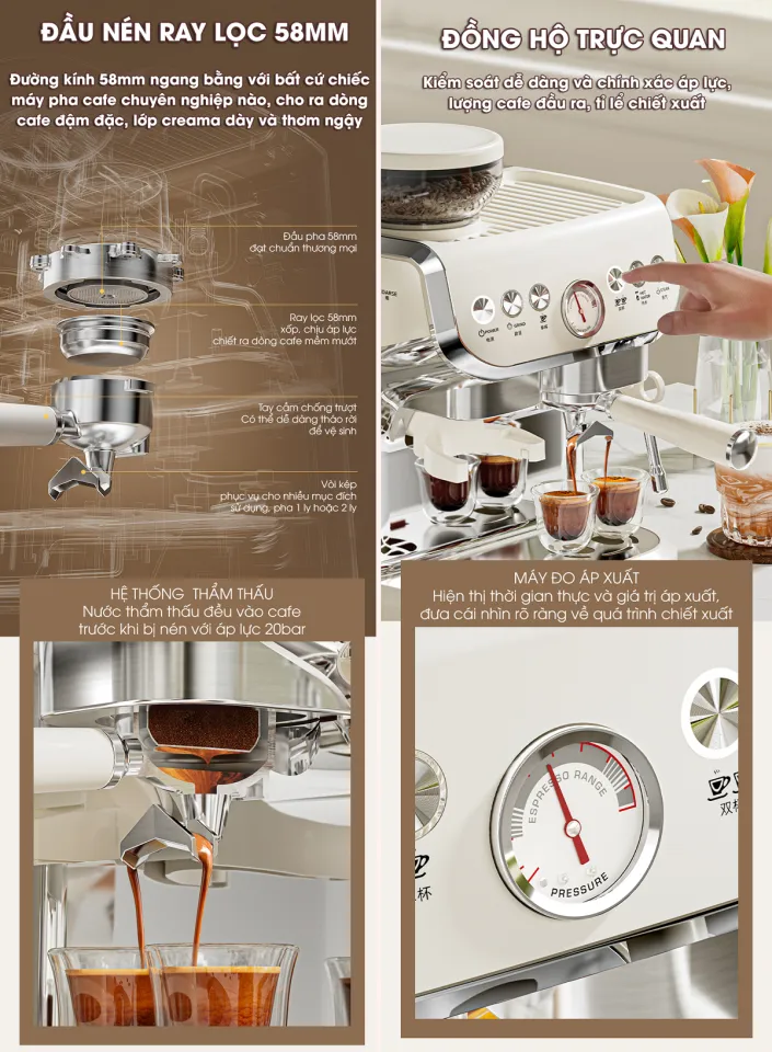 - Đồng hồ đo áp suất: Hiển thị áp suất trong thời gian thực, giúp người dùng tinh chỉnh quá trình pha chế để đạt được hương vị cà phê như mong muốn.